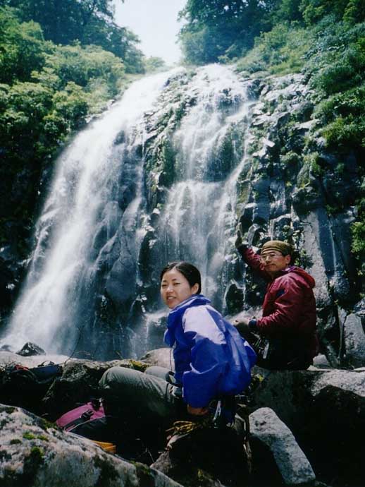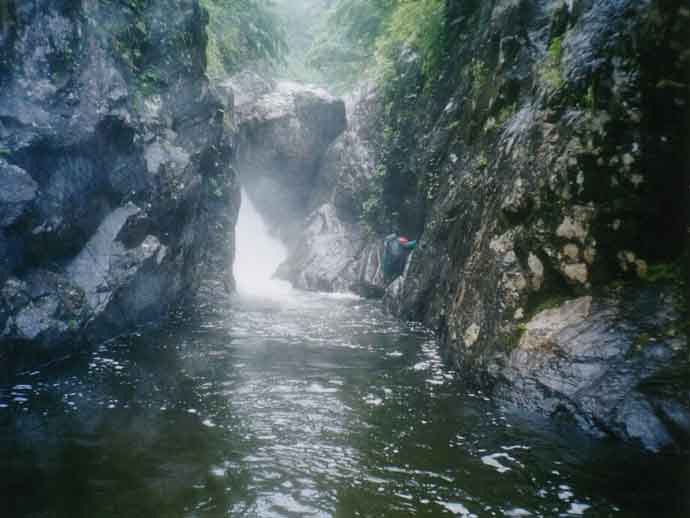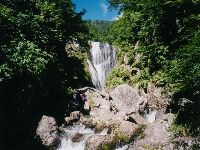 40m大滝は左のカンテから左流水で直登。60m大滝も迫力。その上のナメ